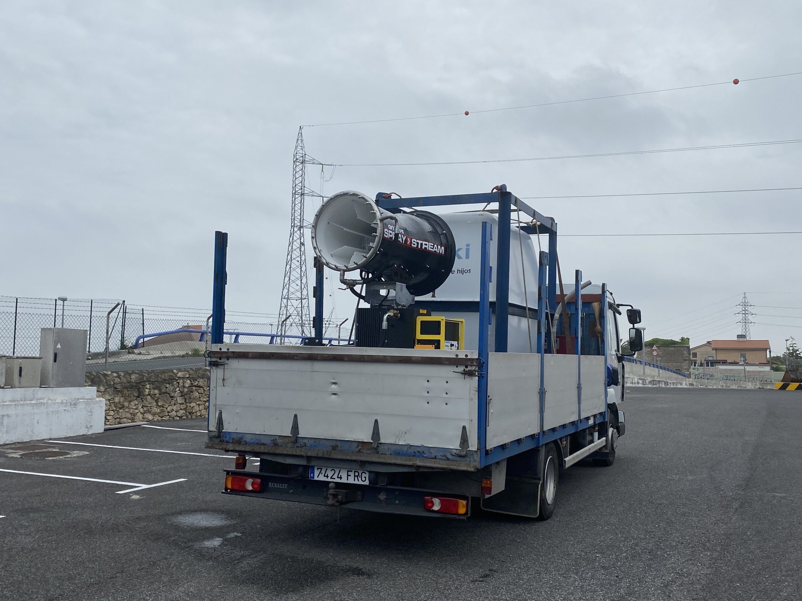 El camión que presta el servicio tiene un cañón y dos depósitos de 3.000 litros de capacidad para albergar la producción de agua nebulizada con disolución de hipoclorito sódico.